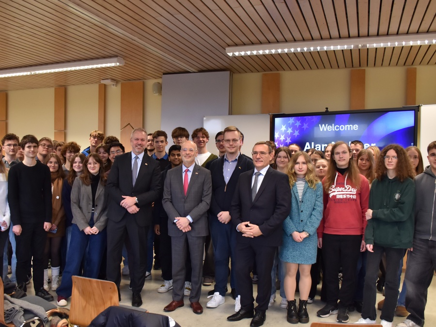Am 07.11.2024 besuchten Generalkonsul John Crosby and Leipzig und Geschäftsbeauftragter Alan Meltzer aus Berlin das Norbertusgymnasium, um mit unseren Schülerinnen und Schülern über US-Politik und insbesondere die Wahlen in Austausch zu treten. Neben Literaturtipps zum besseren Verständnis des amerikanischen Systems ging es unter anderem um die Rolle sozialer Medien im zurückliegenden Wahlkampf sowie um bevorstehende Herausforderung und Veränderungen.